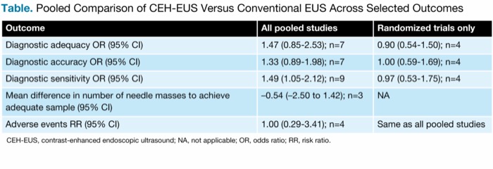 The investigators found no significant differences in the diagnostic adequacy or diagnostic accuracy of the CEH-EUS and conventional EUS methods in their pooled results for all studies or randomized trials only. While there was a significant difference in the diagnostic sensitivity, favoring CEH-EUS, this was driven by the results of non-randomized studies. The investigators noted that they believed these differences were driven by unmeasured or unresolved confounding by baseline factors in these observational studies. Specific measures for selected outcomes are included in the Table.