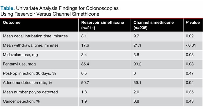 Of 446 total colonoscopies, 211 (47.3%) used reservoir simethicone and 235 (52.7%) used channel simethicone. There were no significant differences between these groups with respect to demographic or procedural factors.