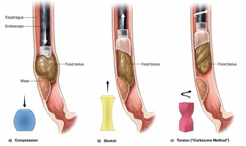 Tensile (pulling) and compressive (pushing) forces act in a straight line and require substantial force to overcome friction, vacuum pressure, and tissue resistance.2 In contrast, torsional stress distributes force radially rather than longitudinally. This takes advantage of the lower shear strength of most biological materials, including impacted food boluses.3
