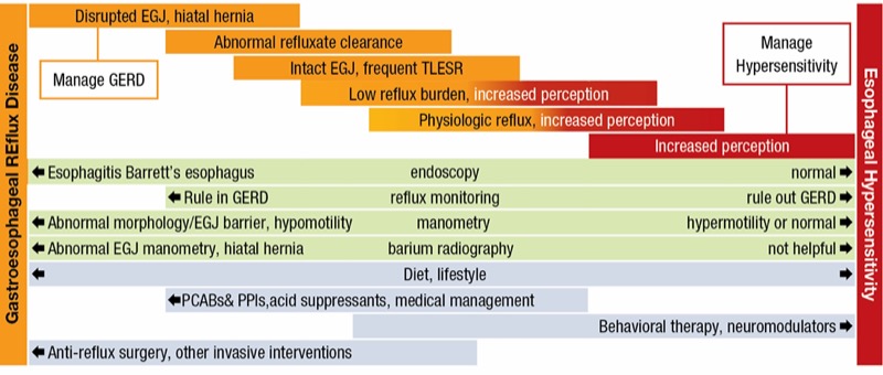 From a pathophysiologic standpoint, the clearest reflux patients will be on one end of the spectrum. These are the patients who have abnormal findings on endoscopy and reflux monitoring, and in whom escalation to anti-reflux surgery will be most likely. In these patients, the aim is to manage acid exposure. On the other end of the spectrum are those patients in whom the aim is to manage hypersensitivity. In these patients, there is a greater need for interventions such as behavioral therapy and neuromodulators.