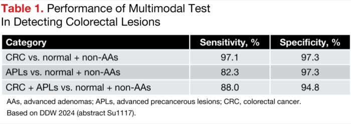 WASHINGTON—A stool-based test that combines three sources of biomarkers of colorectal cancer—mRNA, DNA and hemoglobin—using an artificial intelligence/machine learning–driven algorithm showed high sensitivity for advanced adenomas and other cancer precursors. The presentation detailing the findings drew considerable attention at DDW 2024 (abstract Su1117).