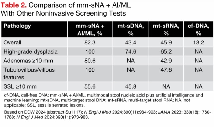 The combined use of the advanced nucleic acid markers and FIT performed well regardless of lesion type (Table 1), and the sensitivity for APLs, by subtype, was much greater that that reported in published studies of the other stool-based screening tests (N Engl J Med 2024;390[11]:984-993; JAMA 2023;330[18]:1760-1768; N Engl J Med 2024;390[11]:973-983) (Table 2).