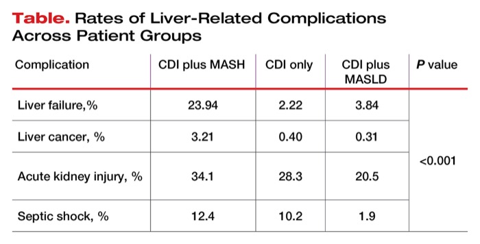Liver-related complications also were higher in the CDI plus MASH group than in those with CDI only and MASLD plus CDI (Table).