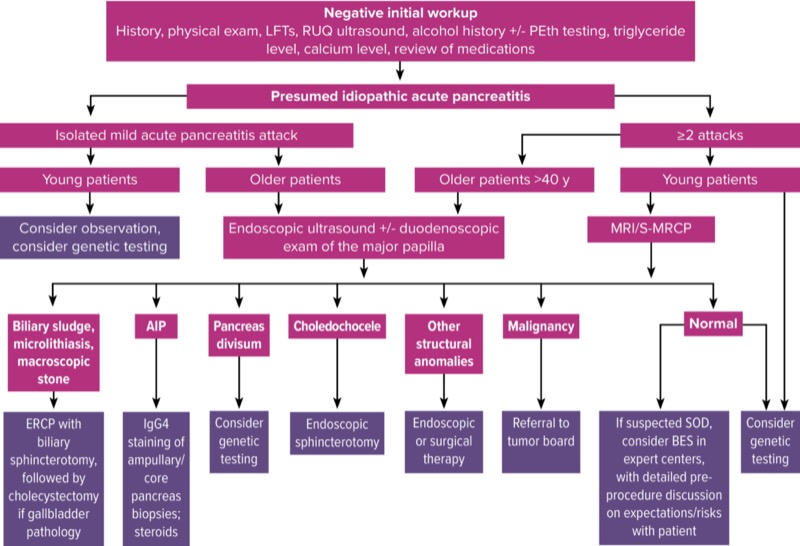 It should be emphasized, however, that the extent of evaluation should be tailored to the patient’s presentation and clearly identifiable risk factors for AP. For example, a patient who presents with 1 or more episodes of AP in the setting of persistently uncontrolled hypertriglyceridemia or ongoing alcohol use disorder may not warrant additional etiologic evaluation. Our algorithm at Indiana University for evaluation of presumed IAP and IRAP is shown in Figure 1.