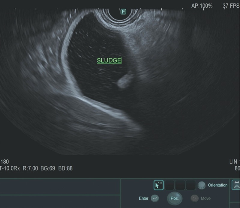 In the past, at the time of ERCP, it was recommended that bile be collected from the duodenum or bile duct after gallbladder stimulation with cholecystokinin or by direct cannulation of the gallbladder.36,37 Today, however, ERCP rarely is performed specifically for bile crystal analysis, given the risk for post-ERCP pancreatitis and the high sensitivity of EUS in detecting biliary sludge and microlithiasis (Figures 2 and 3A). Furthermore, TUS technology also has advanced significantly, with improved detection rates.