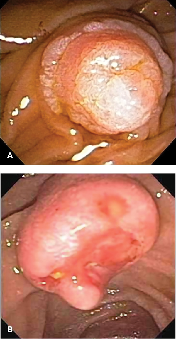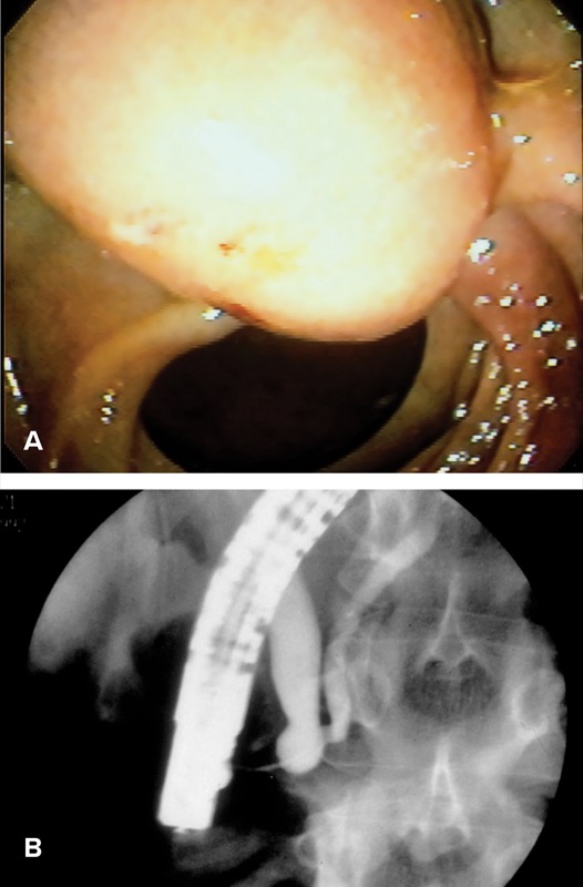 Ampullary tumors, either benign (Figure 6A) or malignant (Figure 6B), also may present with AP. A wide variety of benign tumors can arise at the major papilla, including adenoma, lipoma, fibroma, lymphangioma, leiomyoma, and hamartoma, with adenomas being the most common.108 Patients with hereditary conditions such as familial adenomatous polyposis may have duodenal adenomas involving the major papilla, which can lead to presentation at a young age with AP.