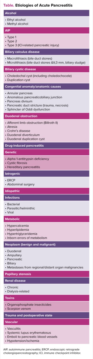 Gallstone disease and alcohol dependence cause most cases of acute pancreatitis (AP), with gallstone disease estimated to cause between 40% to 70% of cases and alcohol estimated to cause 25% to 35%.1-3 Other less common causes of AP include hypertriglyceridemia, hypercalcemia, adverse drug effects, pancreatic and ampullary neoplasia, complications of ERCP, and abdominal trauma. A comprehensive list of known causes is provided in the Table.