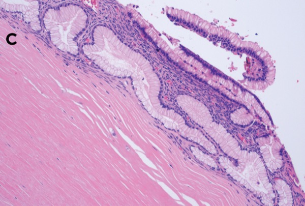 A 71-year-old woman is found to have a pancreatic tail cyst during a right upper quadrant ultrasound to work up mild transaminitis. She undergoes MRI, which reveals a rim-enhancing cystic lesion in the pancreatic tail measuring up to 5.1 cm without definitive communication with the main pancreatic duct (Figure 3A). EUS reveals a unilocular 45- × 62-mm cyst with a thick wall without communication with the main pancreatic duct (Figure 3B). Cyst aspiration is performed. The CEA level is 132,270 ng/mL, and the amylase level is 28 U/L. Cytology revealed cyst contents without any evidence of malignancy. The patient undergoes a distal pancreatectomy, and the pathology reveals an MCN with low-grade dysplasia (Figure 3C).